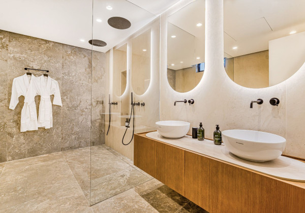 The upper level houses the impressive master bedroom with an en-suite bathroom and direct access to a spacious private terrace, offering panoramic sea views. Two additional bedrooms share a bathroom and have direct access to the terrace, providing bright and comfortable spaces for residents.