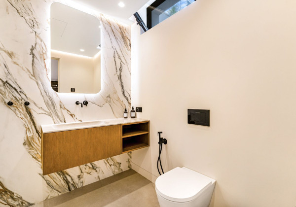 On the main level, a spacious living area divided into sitting and dining spaces creates a perfect setting for family life and entertaining. The open-plan kitchen, fully equipped with state-of-the-art appliances and stylish finishes, complements the villa's modern design. Also on this level, a bedroom with an en-suite bathroom and a guest toilet provide convenience and privacy.