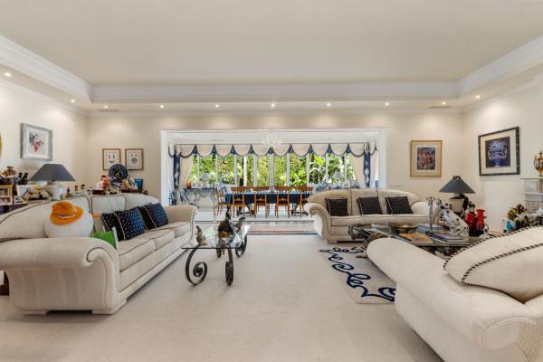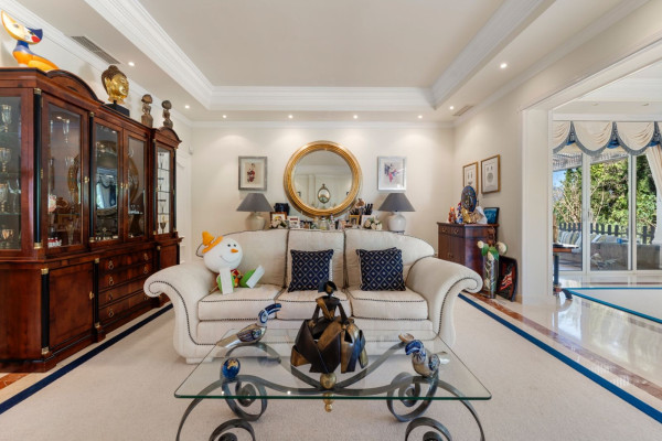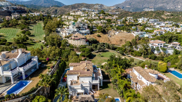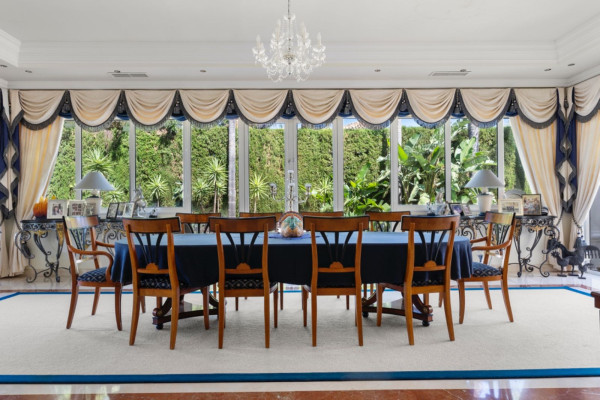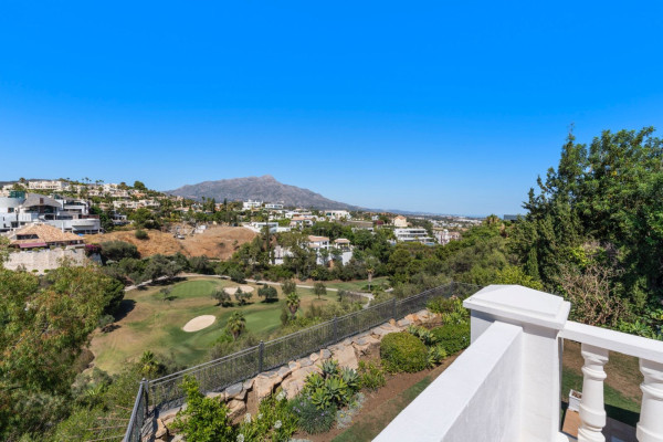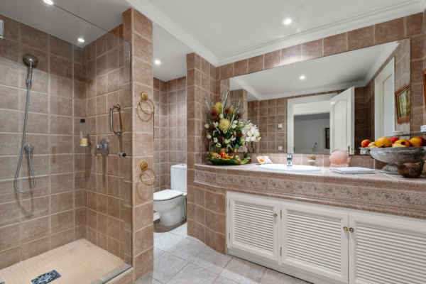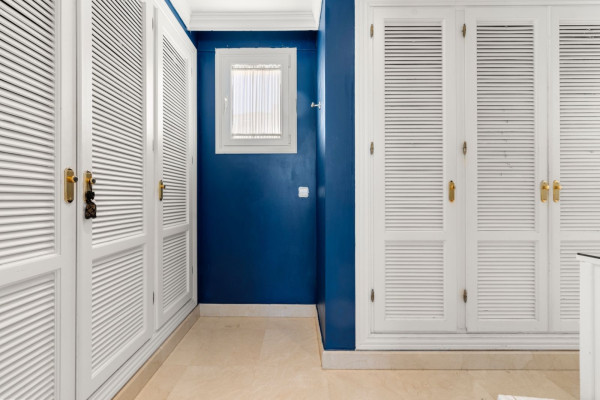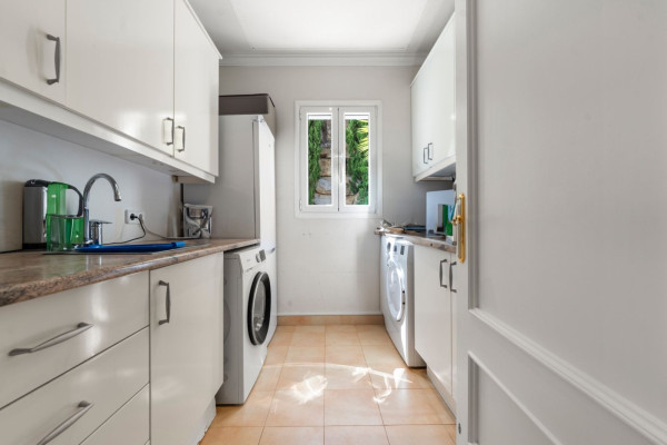 On this ground floor the kitchen is open, airy and takes in magnificent views across the golf valley and over to La Concha mountain, looming majestically in the background. Decorated in warm golden tones alongside crisp whites, the kitchen is naturally illuminated by expansive windows along one side. In one corner the breakfast area is embraced by these windows, making this the perfect place to sit for breakfast, and enjoy the valley view. There is also a comprehensive laundry room, fully equipped with a fridge/freezer, sink and a myriad of cupboards and drawers, guaranteeing an impressive amount of storage space.