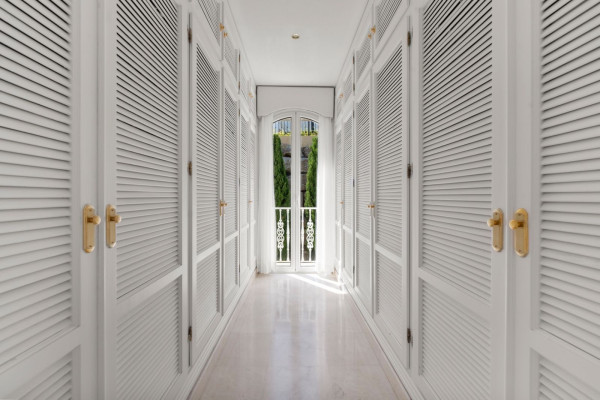 On the first floor there are two further bedrooms. The first is sumptuous with its furnishings in soft neutral tones. Brightly lit by swathes of natural light filtering in through glass terrace doors, the effect is dazzling. With an open fireplace taking centerstage in the bedroom, a vast walk in wardrobe in crisp white wood, leading through to a huge bathroom ensuite, this is a haven of privacy and relaxation. Double sinks and an elevated bathtub surrounded by windows, the bathroom is as colonial as it is traditional.