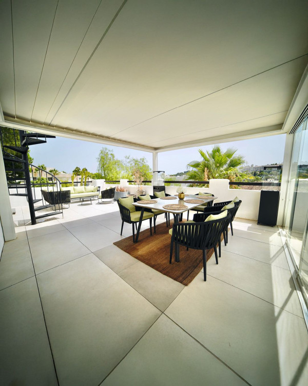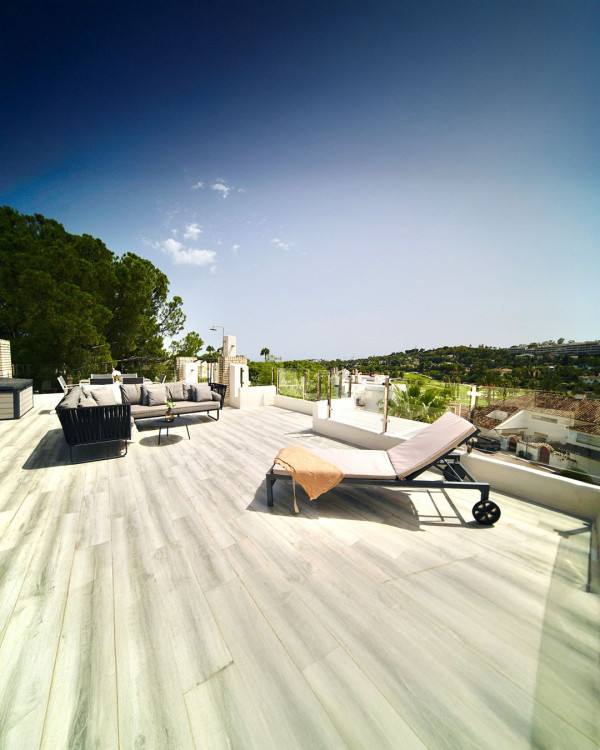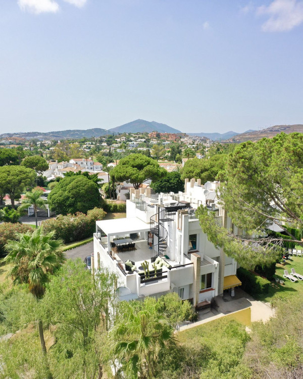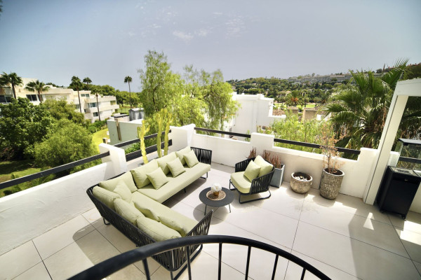 Nestled within a tranquil gated community in Nueva Andalucía’s prestigious Golf Valley, this exceptional, penthouse combines sleek Scandinavian design with unrivaled privacy and stunning golf course views. Surrounded by lush, manicured gardens, the residence overlooks the first fairway of Las Brisas Golf and offers free parking right outside your private lift, which takes you directly to the apartment entrance.