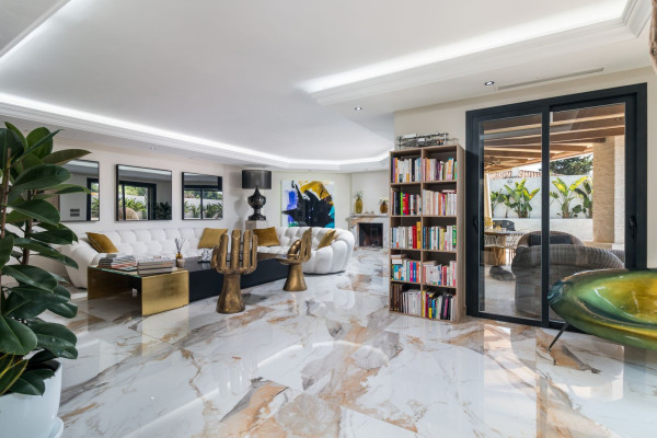 Nestled in a quiet residential area of Nueva Andalucía and yet close to all local amenities we find this house for sale. The property has gone through an extensive refurbishment and updating recently and now offers many contemporary features and yet it feels a lived in family home. The accommodation comprises and open plan kitchen/dining area, a more formal lounge that opens to the gardens and pool area, 4 bedrooms and 4 bathrooms as well as office space. Outside the garden is on a split level and includes a sitting and dining area , swimming pool, gazebo overlooking the gardens and pool. Other features include a double integral garage, store room, laundry room and air conditioning throughout. Viewing essential.