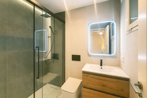 The apartment features three spacious bedrooms, all with new, lined, and illuminated built-in wardrobes, as well as ceiling fans and a powerful air conditioning system (8,000 frigories) that ensures maximum comfort throughout the year. The master bedroom has an en-suite bathroom with a modern shower and access to a balcony overlooking the interior of the complex, while the other two bedrooms—one currently used as a dressing room—share a second full bathroom. Both bathrooms stand out for their complete renovation with top-quality finishes, each featuring exterior windows that provide perfect ventilation. They include sliding glass shower screens designed to offer greater comfort and elegance.